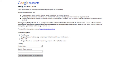 4. Lastly, you will be asked to verify your account. Google will give you 2 options. You can either send a text message to your mobile phone that will include a verification code, or you can have Google give you an automated phone call with a 5 digit pin code. Choose whichever option is more convenient, and once you receive your pin code enter it on the next screen.